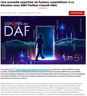 À l’occasion du 11ème Congrès des Directeurs Administratif et Financier organisé par le cabinet HDM le 9 octobre prochain, les représentants de BNP Paribas Réunion présenteront la nouvelle offre de BNP Paribas Conseil M&A, désormais déployée à La Réunion.